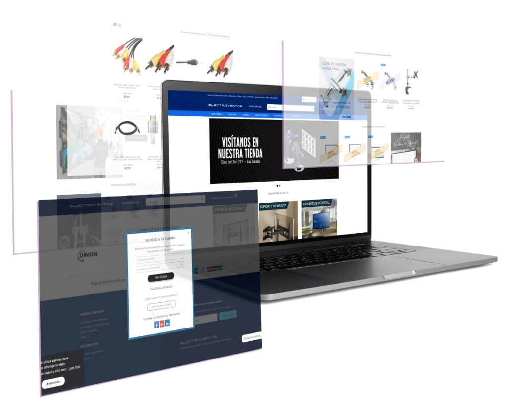 Electroventas es una tienda que se dedica a la venta de soportes, cables, adaptadores y telones. Actualmente cuentan con una línea B2C para los clientes personas y se ha habilitado una línea B2B, completamente digitalizada para las cotizaciones y compra con línea de crédito a través del sitio web.